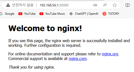 - NodePort로 설정된 Service로 인해 외부에서 접속이 가능한 상태이다.